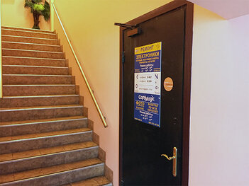 Выход из метро направо, через проулок в арку, после поворота фотосалон CopyMagic под вывеской "Фото, Ксерокс, Визитки, Печати"..